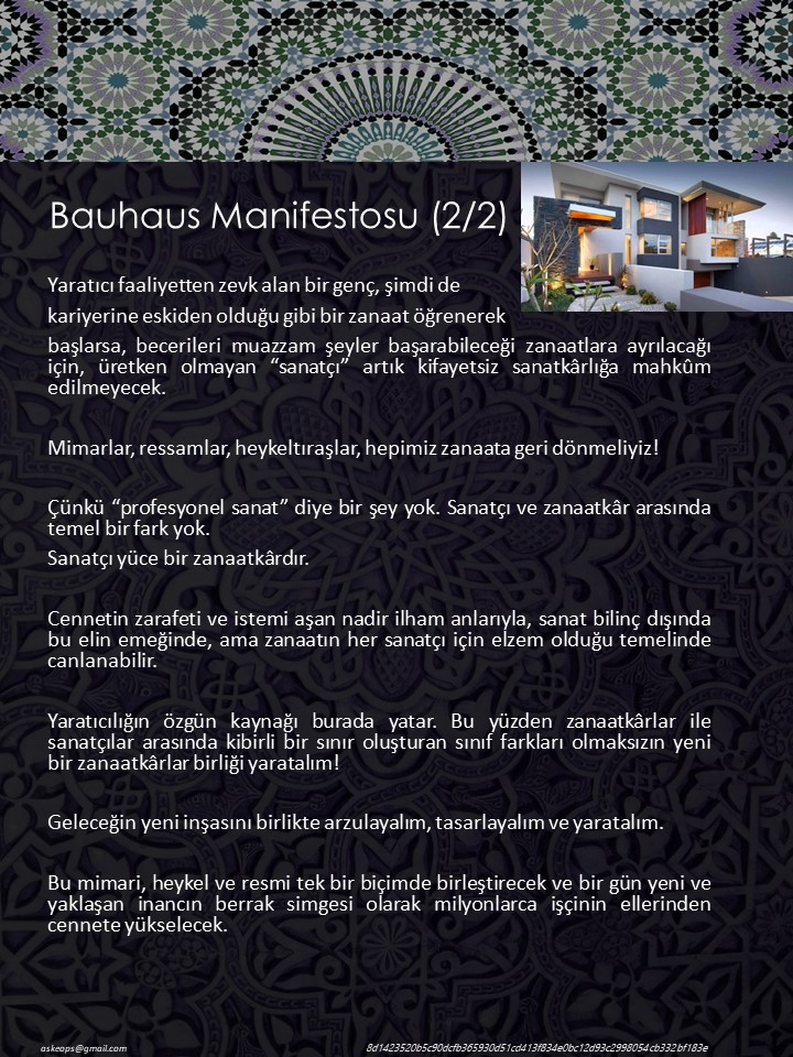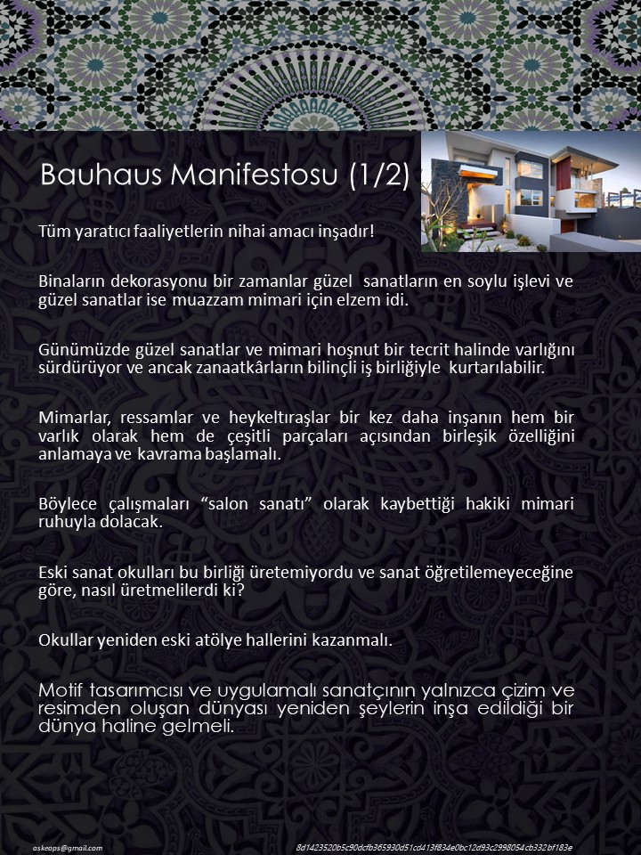Mimari akımları incelerken karşılaştığım bazı kavram ve yaklaşım biçimlerini aşağıdaki şekilde bilgi kartlarına dönüştürdüm. Aslında neden böyle farklı yaklaşımlar ve farklı formlarda bilgileri oluşturduğumu ben de zaman zaman düşünmüşümdür. Bauhaus Sanat Akımı ile ilgili metinleri okuduğumda, her bir olay ve unsuru farklı biçimlerde ele alınabileceğini ve hatta farklı formlarda ele alınması gerektiği sonucuna ulaşabilmek beni memnun eden bir husus oldu. Tabiki önceliklikle formun neden fonksiyonu izlemesi gerektiğini özet olarak irdelemek uygun olur düşüncesindeyim.