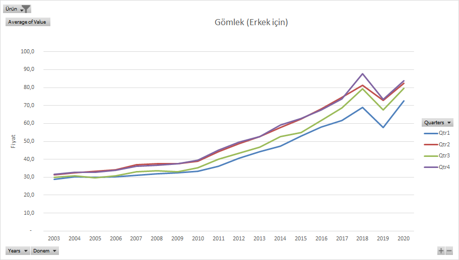 Kadın gömleğinde de benzer bir durum olmakla birlikte Q2’deki ayrışma daha belirgin görünüyor. Nedense her yılın ilk çeyreğindeki ortalama fiyat diğer çeyreklerin üzerinde gerçekleşmiş