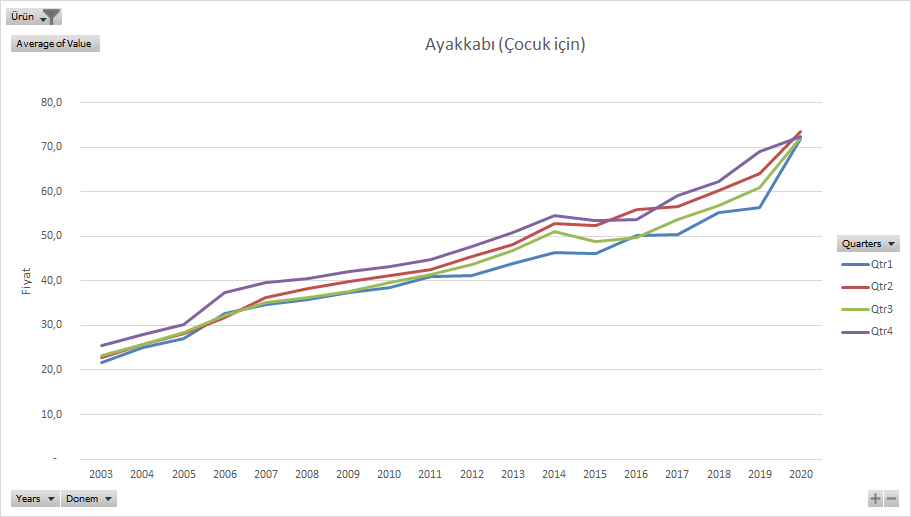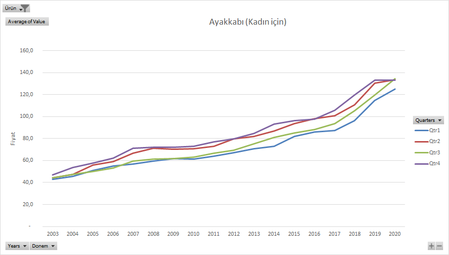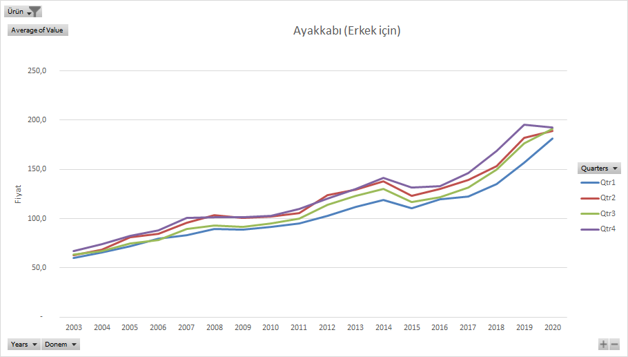 Gömleğe bakında, aklıma ayakkabı geldi acaba dış giyim konusunun tamamında mı benzer durum var diye 2020 itibarıyla erkek ayakkabı 180-200 TL bandında gibi görünüyor ve çeyreklik durum farklılaşması burada da görünüyor.