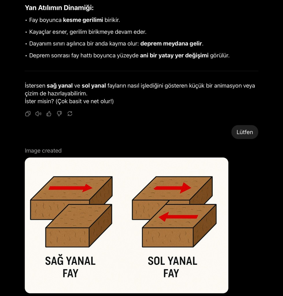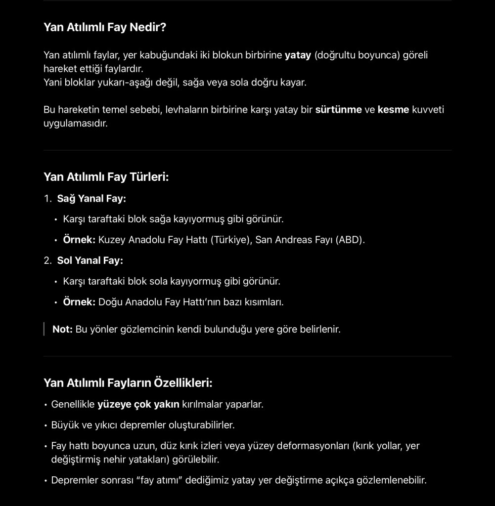 Yan Atılımlı Fay (Strike-Slip Fault): Levhalar birbirine paralel şekilde yatay olarak hareket eder. Sağ yanal veya sol yanal olabilir: Sağ Yanal (Örn: Kuzey Anadolu Fayı): Karşı taraf sağa kayar gibi görünür. Sol Yanal: Karşı taraf sola kayar gibi görünür. Genellikle depremleri güçlü olur.
