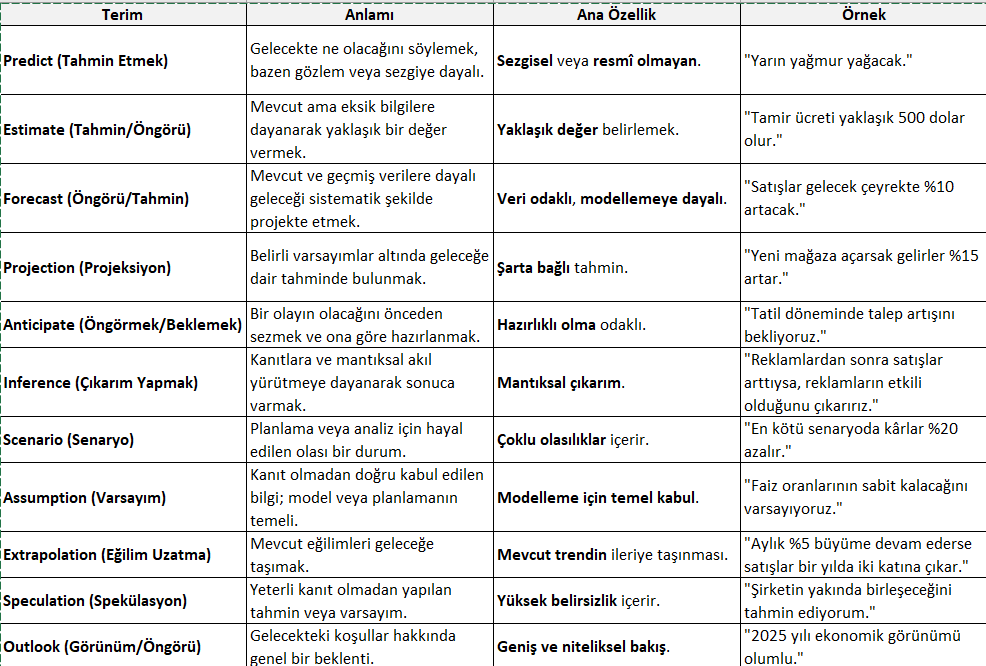 İngilizce’de bulunan bazı geleği tahmin etmek ile ilgili terimleri aşağıda karşılaştırmalı olarak sunmaya çalıştım. Umarım faydalı olur.
